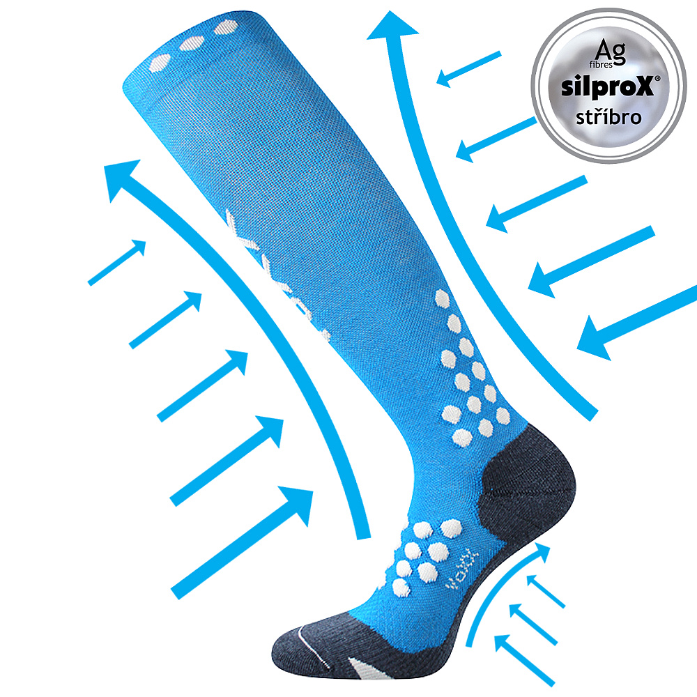 Anatomicky tvarované polstrované zóny bránia vzniku otlakov a pľuzgierov. Vďaka kompresii napomáhajú pevnejšiemu držaniu a vyššej stabilite členku, zapletením materiálu silproX® s iónmi striebra zaisťuje antibakteriálnu ochranu a jemné polstrovanie materiálom DRYTEX zaistí maximálny komfort a odvod potu pri vysokej športovej záťaži. Kompresné podkolienky sú v teplotnej triede A, vhodné do rozmedzia teplôt od +10 °C do +35 °C.