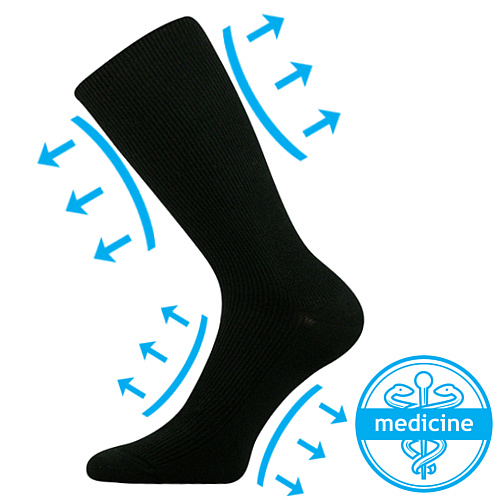 dámske-pánske špeciálne voľné ponožky vhodné pre diabetikov a extrémne opuchnuté nohy, retiazkovaná bezšvová špica zamedzuje otlakom prstov, ktoré môžu vzniknúť pri klasickom zošití, extrémnu rozťažnosť a voľný lem zamedzuje otlakom a zaškrtením prietoku krvi, rebrovaný úplet